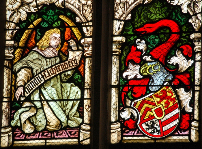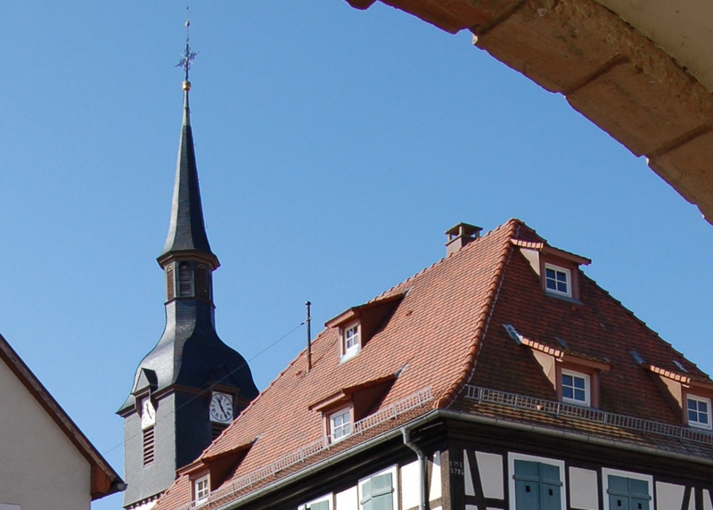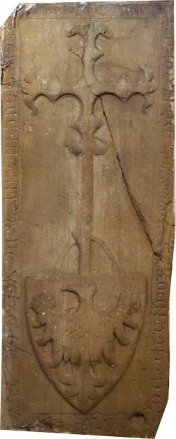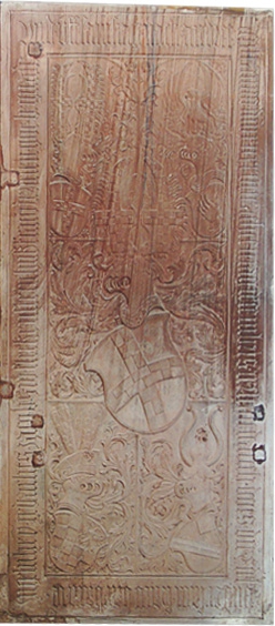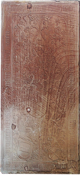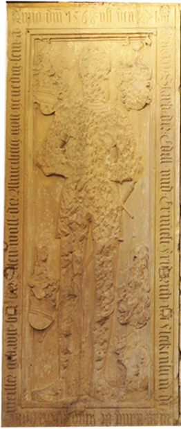 • Jacob II von Fleckenstein et son épouse Barbara von Ingelnheim, décédés à huit jours d'intervalle en décembre 1526 (voir p. 5 et 6). La tombe de Jacob II von Fleckenstein porte l'inscription suivante: "En l'an de grâce 1526, le dimanche après la St-André, le deuxième jour du mois de décembre décédait le noble chevalier Jacob von Fleckenstein, un vogt à Germersheim. Que Dieu garde son âme !". La pierre tombale de droite, celle de son épouse Barbara von Ingelnheim, la mieux conservée d'entre toutes, est gravée d'une épitaphe en lettres gothiques: "Et le samedi après la St-André, en l'an de grâce 1526, le huitième jour du mois de décembre, disparut également la noble et fidèle épouse Barbara von Ingelnheim". Le centre de la pierre est occupé par les armoiries de la défunte, le blason des Ingelnheim .