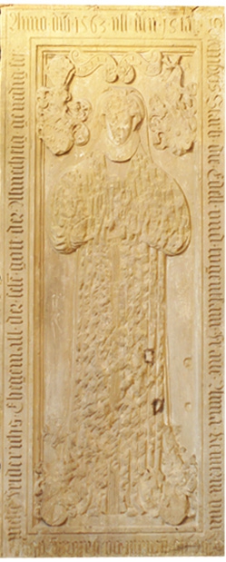 La pierre tombale à l'extrême droite du choeur est la mieux conservée. Elle est ornée d'une grande croix tréflée à laquelle est accrochée, comme à un arbre de vie, le blason des sires d'Ettendorf (un aigle). Le pourtour de la dalle étant partiellement ébréché, la lecture de l'épitaphe latine s'avère délicate. On décrypte néanmoins que le 3ème jour avant la Chandeleur (31 janvier) 1302, décéda la noble dame Gertrude, fille d'Eberhard d'Ettendorf, épouse de Wolfram de Fleckenstein. Il s'agit donc de l'épouse de Wolfram II de la ligne aînée des Fleckenstein (future lignée des Dagsthul) vraisemblablement décédé en 1317, et dont la dalle funéraire est actuellement visible à Niederhaslach.
