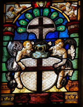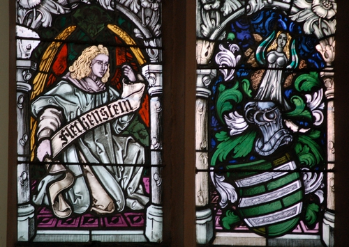 A l'extérieur du choeur, entre les contreforts côté sud, à gauche de la petite porte gothique, est apposée une pierre énigmatique. Elle porte en tête, pour seul ornement deux blasons: celui des Fleckenstein (trois barres) et celui des Andlau (une croix) Sans doute existait-il autrefois une inscription sur sa partie intérieure donnant ainsi un sens à cette pierre. Mais comme cette inscription a disparu depuis longtemps, on se perd en conjecture. S'agit-il de la dalle funéraire d'un enfant ou d'une pierre commémorative d'un mariage entre ces deux familles nobiliaires? A deux reprises une telle union fut célébrée. En effet, Eberhard 11 d'Andlau (décédé avant 1264) était marié avec Adélaïde de Fleckenstein, fille de Henri de Fleckenstein et Cunégonde de Baerendorf (ou Ettendorf ?) Et de même Véronique d'Andlau (décédée en 1496) était l'épouse de Jacques de Fleckenstein (décédé en 1514). Mais vue la facture des blasons, cette pierre doit se rattacher à la première union établie au 13ème siècle.